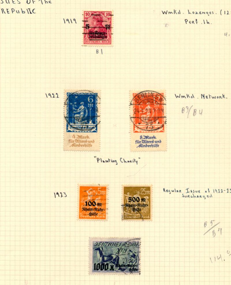 GERMANY 1919-1953 COLLECTION STAMPS F-VF */**/O. Album The Favorite containing a collection of 279 stamps and 5 souvenir sheets mint and used. I noted B3-4/o, B5-7/o, B59-67/o (no B66), B69-78/o, B82-89*, B90/o, B91-92/o, B93-101/o, B107-15/o, B123-31/o, B148-59*, B160-68/o, B218-29**, B231-36**, B257-69**, B294-95*B314-15*, B316-17*, B318-19*, B320-23*, B327-30*, B334-37*, C46-54/o. Owner's catalog $1580.00 CAD. (Image1)