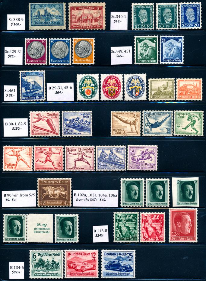 GERMANY 1924-42 SELECTION STAMPS F-VF **. Selection of 161 stamps mint never hinged between numbers 338 and 461, B29 and B208, O3 and O38, N58 and N75, NB 8 and NB40. Most of the stamps are identified with Scott numbers. Se-tenant stamps (14) are lightly hinged. Owner's catalog $1325.00 CAD. (Image1)