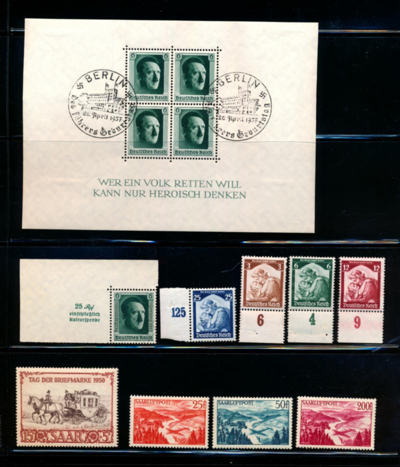 GERMANY SAAR 1934-50 SELECTION STAMPS F-VF */**/O. Selection of 119 mint and used stamps. I noted: Germany 448-51** Margins and numerals, B82-89/o, B177-85/o, B194-97**, B218-29**, 5NB1-4*, 5NB5-8*, 5NB12-14*, O80-91/o, Saar B76**, B77-81** x2, C9-11**. Scott $760.00 CAD. (Image1)