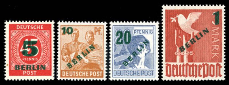 GERMANY BERLIN 1949 #9N64-67 STAMPS XF **. German stamps surcharged Berlin, for use in the American, British and French occupation sectors. Superb set of 4 stamps mint never hinged and all signed by German expert Schlegel on back. Scott $270.00 CAD. (Image1)