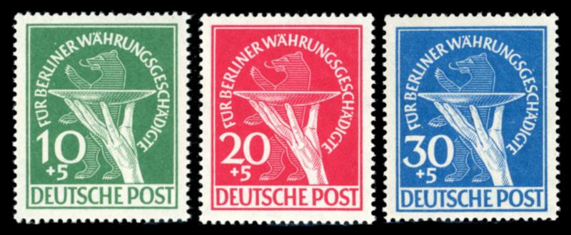 GERMANY BERLIN 1949 #9NB1-B3 STAMPS XF **. Stamps with surtax for Berlin victims of currency devaluation, superb set of 3 stamps mint never hinged. Scott $330.00 CAD. (Image1)