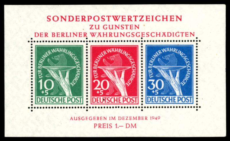 GERMANY BERLIN 1949 #9NB3a S/S XF **. Stamps with surtax for Berlin victims of currency devaluation, superb souvenir sheet of 3 stamps mint never hinged. Scott $1360.00 CAD. (Image1)