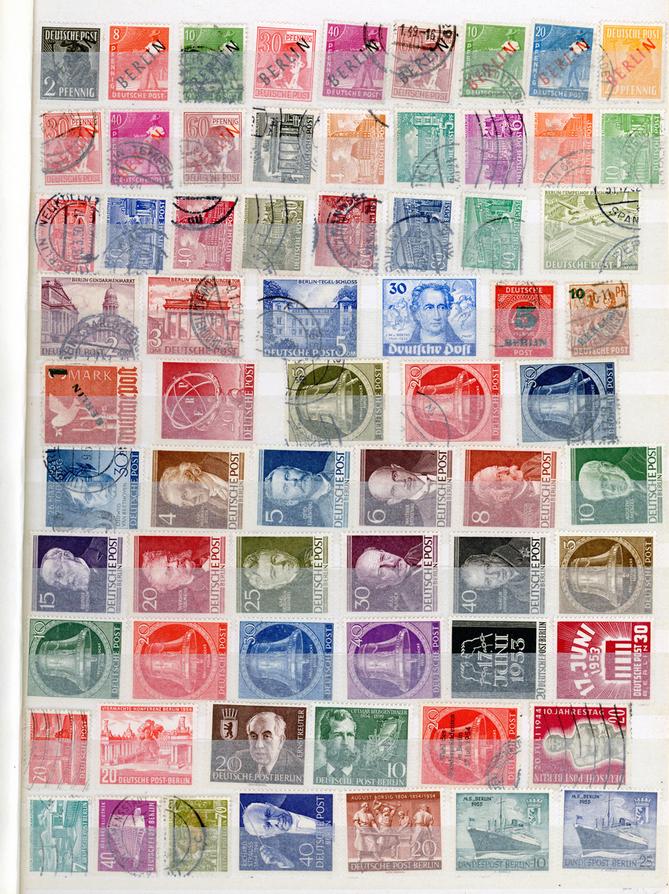 GERMANY BERLIN COLLECTION STAMPS VF **/*/O. Stockbook containing a collection of 628 stamps and souvenir sheets mint and used. I noted #9N63/o, 9N80/o, 9N84-93*, 9N94-98*, 9N115**, 9N284-301*, 9NB1-3*, 9NB4-5*, 9NB6-7*. High catalog value. Starting bid $100.00. (Image1)