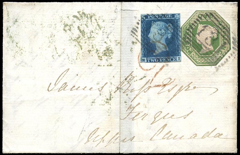 2,5: TWO PENCE BLUE and ONE SHILLING EMBOSSED cut to shape tied to folded letter, with red '2' handstamp, 28 APR 1853, green LIVERPOOL 29 AP double split ring and oval L AP 4, to Fergus Upper Canada, GUELPH 16 AP 1853 serifed double split ring transit and red 16 MY 1853 C.W double split ring receiver. Stamps barely adhering. (Image)