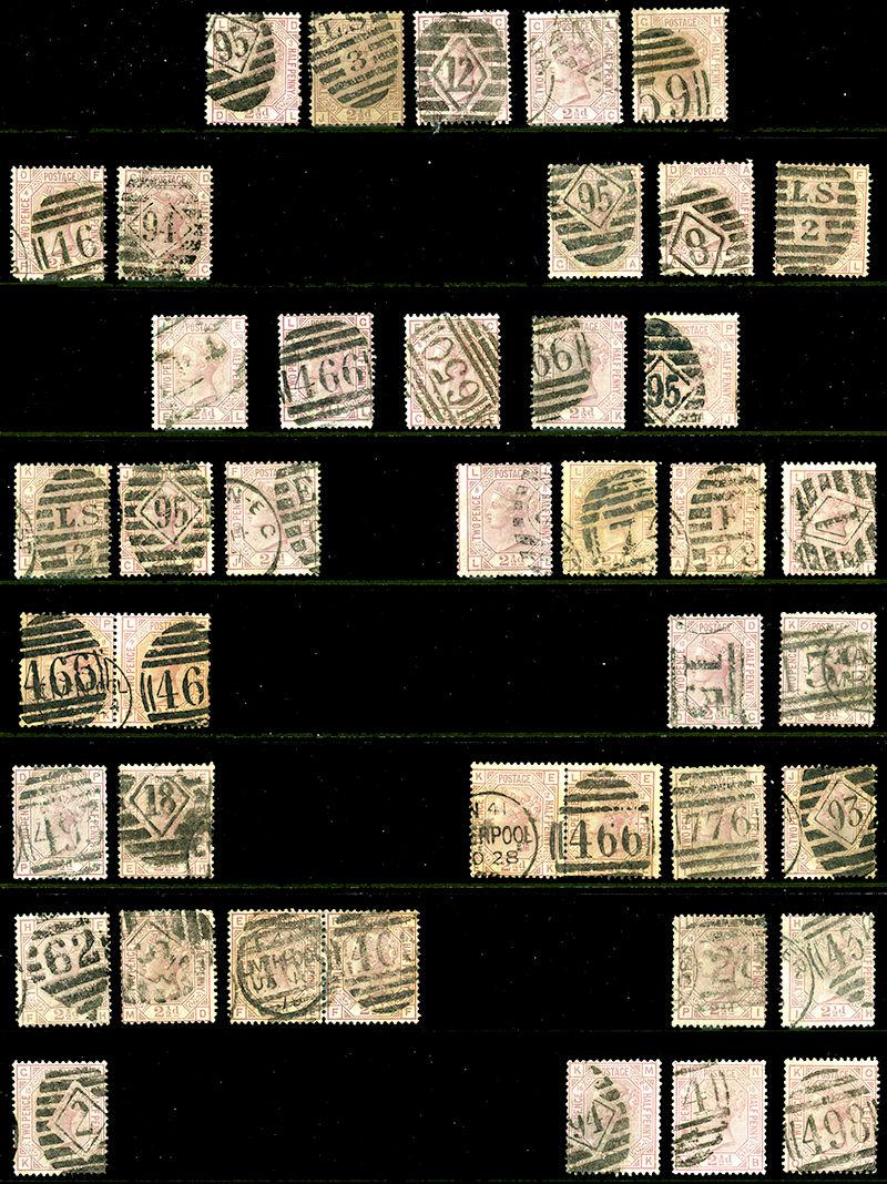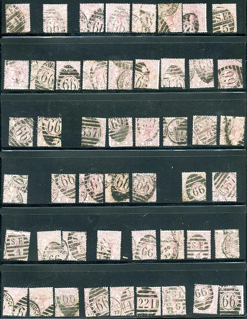 67: Forty-two used 2½d claret, mostly different plates/positions incl a couple of pairs, with Plate No's 3 (4), 4 (3), 5 (3), 6 (5), 7 (3), 8 (4), 9 (2), 10 (2), 11 (2), 12 (4), 13 (4), 14 (2), 15 and 16 (3), range of shades and cancels, a few (mostly small) faults, generally clean and f-vf. (SG 141- £1820) (Image)