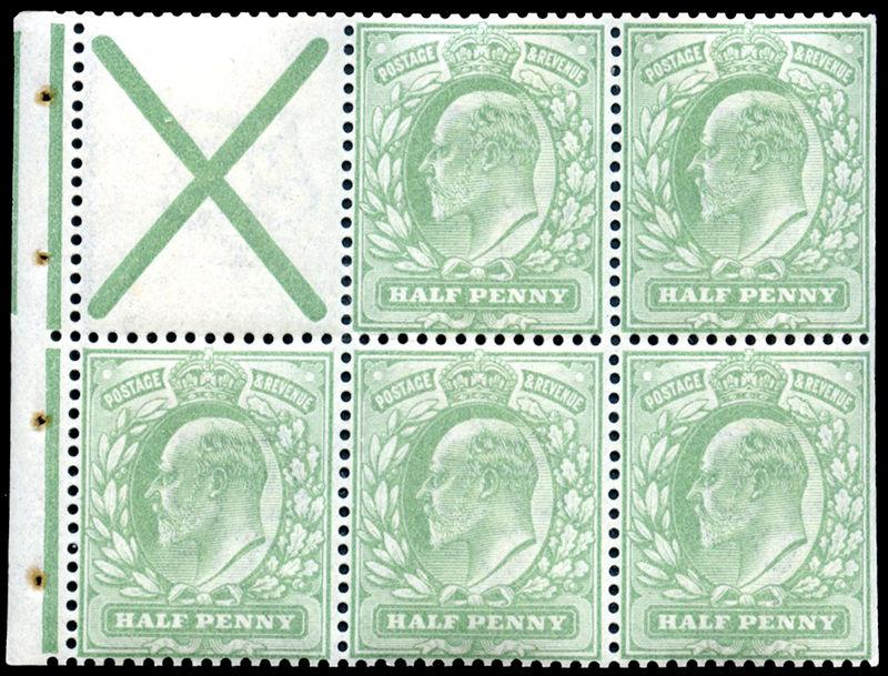143b var: ½d pale yellow green, booklet pane of 5 plus St Andrew's Cross label, with INVERTED WATERMARK, small rust marks at staple holes, og, hr, fine. (SG 218bw - £975) (Image)