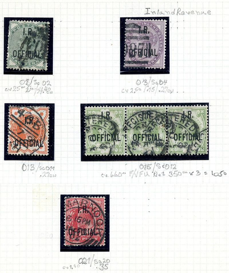 O2/O112: Fifteen used, including strip of three of 1/- I.R. ovpt (#O12) with minor faults, appears mostly f-vf (Image)