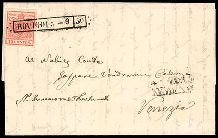 Lombardy-Venetia, 1850 Arms 15c red, hand-made paper, type I. With four margins, tied on 1850 folded letter from Rovigo to Venice with boxed "Rovigo 5-9 50" datestamp, Venice receiving backstamp, Very Fine to Extremely Fine. Michel No. 3 X a. Sassone No. 3. Scott No. 4b; Estimate $100 - 150. US$100-150 (Image)
