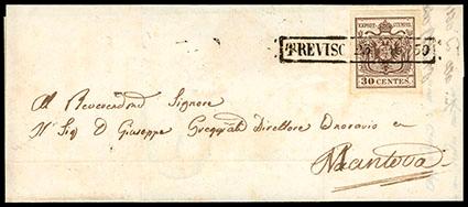 Lombardy-Venetia, 1850 Arms 30c pale brown, hand-made paper, type I. With four large even margins, tied to 1850 folded letter to Mantova, with boxed "Treviso, 23.10.50" datestamp, receiving cds on reverse, Extremely Fine, a very clean and attractive cover. Michel No. 4 X a. Sassone No. 7. Scott No. 5c; Estimate $100 - 150. US$100-150 (Image)