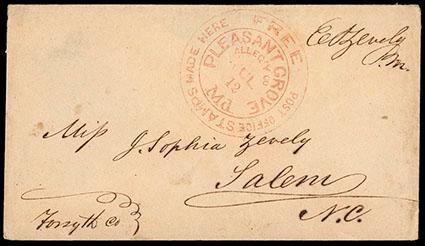 Pleasant Grove, Md., Aleg'y Co., Jul 12, Free Post Office Stamps Made Here. Full red double-circle datestamp and free frank "E.N. Zevely, P.M." on folded letter to Salem N.C. letter from Zevely to his wife enclosed, Very Fine, a lovely example of one the most celebrated 19th century fancy postmarks, ex-Meroni. Estimate; $750 - 1,000. US$750-1,000 (Image)