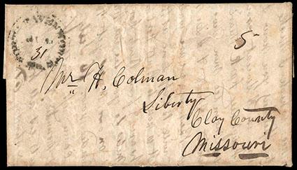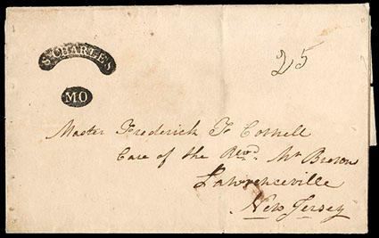 St. Charles, Mo. Bold sharp strike of negative fancy oval postmark on folded lettersheet to Lawrenceville, N.J., manuscript "25" rating, Extremely Fine and choice,ex-Seacrest & Conlan. Estimate; $3,000 - 4,000.