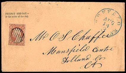 1851, 3¢ orange brown, type I. Margins clear to just in at top left, canceled by sock-on-the-nose black circular grid handstamp on cover to Mansfield Center, Conn., blue "Buffalo, N.Y., 3, Aug. 14" integral rate cds at right, very interesting and rare "Pre-Pay, Pre-Pay-- Is the Order of the Day" propaganda imprint designed to promote the usage of postage stamps, with 1851 enclosure, Very Fine and choice, a very rare and fascinating postal history item. Scott No. 10; Estimate $500 - 750. US$500-750 (Image)