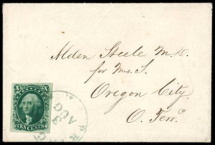 1855, 10¢ green, type III. Four nice even margins with deep rich color, tied to small envelope by blue "Princeton, N.J., Aug 3" cds paying the transcontinental rate to Oregon City, Oregon Territory, Very Fine and attractive, a clean cover to a scarce destination. Scott No. 15; Estimate $300 - 400. US$300-400 (Image)