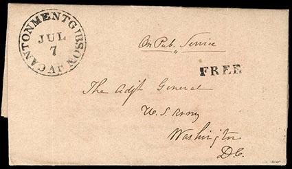 Cantonment Gibson, Ar., Jul 7 (1842) (Cherokee Nation). Excellent strike of black cds and matching "Free" handstamp on neat 1842 folded letter to the Adjutant General of the U.S. Army in Washington D.C., endorsed "On Pub. Service", the letter is datelined "Head Qt. 1st Regt Dragoons/Camp at Fort Gibson, July 4th '42" and reads "In compliance with instructions from the commg. General of the 2nd Dept., I shall leave here this day to resume command of the Post of Fort Leavenworth" and signed by Col. S. W. Kearny, Extremely Fine,ex-Bleuler. Estimate; $1,000 - 1,500.