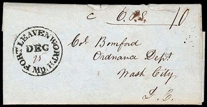Santa Fe, October 19, 1846. Dateline on folded letter from Capt. Samuel H. McMillin (Co. D, 2nd Regiment Missouri Mounted Volunteers) to Col. Bomford, Ordinance Dept., Washington D.C., carried by military courier and entered the mails with "Fort Leavenworth, Mo., Dec 25" cds and manuscript "10" rate, with manuscript "c O.P.S." endorsement alongside (charge On Public Service), enclosure a receipt for sundry Ordinance stores; couple small tears at top, otherwise Very Fine. Estimate; $1,500 - 2,000.