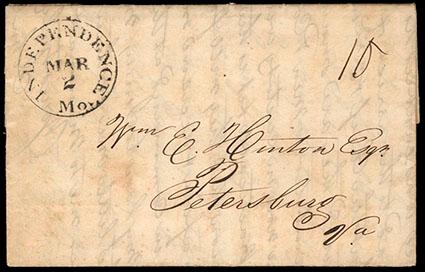 A SUPERB EXAMPLE OF THE NEGATIVE ST. CHARLES, MO. TOWN CANCEL. ONE OF THE FINEST AMONG AN ESTIMATED EIGHT KNOWN EXAMPLES OF THIS DISTINCTIVE MISSOURI TOWN HANDSTAMP. US$3,000-4,000 (Image)