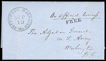 Jefferson Barracks, Mo., Sep 19 (1848) (Missouri). Sharp strike of cds on fresh 1848 folded letter to Washington D.C., with matching "Free" handstamp and manuscript "On Official Business" endorsement, sent by Major Stephen Kearny confirming his commission as Brevit Major General, Very Fine and choice. Estimate; $1,000 - 1,500.