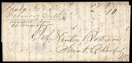 Santa Fe N.M., February 24th (1849). Military adjutant endorsement on 1849 datelined folded letter to Saint Charles Mo., carried military courier on the Santa Fe trail, entered mails with manuscript "Westport Mo., 26 March" postmark and matching "10" rating; some edge wear, Very Fine. Estimate; $4,000 - 6,000.