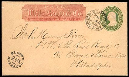 Wells Fargo & Co., Paid. Company red frank on 1855, 10¢ Nesbitt entire (U16) to Philadelphia, Pa., with choice strikes of "Blood's Penny Post, May 14, 1858" cds canceling indicia and "Blood's Despatch, 2Cts." rimless circular handstamp at lower left; small corner repair and stain removes with backflap reattached, Extremely Fine appearance, a wonderful appearing western express and Eastern local city delivery usage, with 1997 & 2011 P.F. certificates. Estimate; $500 - 750. US$500-750 (Image)