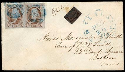1847, 5¢ brown orange, two singles. Bright true color, slightly overlapping on cover to Boston, Mass., tied by blue grid handstamps with matching "Philada., Pa., 10, Dec 20" integral rate cds, in combination with Blood & Co., 1850 (1¢) bronze on black (15L13) acid tied, Very Fine, a scarce shade and local issue combination, with 2010 P.F. certificate. Scott No. 1d; Estimate $750 - 1,000. US$750-1,000 (Image)