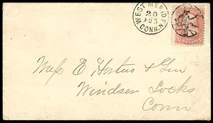 1861, 3¢ rose. On cover to Windsor Locks, Ct., tied by "West Meriden, Conn., Aug 20" cds and fancy Devil & Pitchfork in Circle duplex, Very Fine and choice, a lovely strike of this elaborate 19th Century Fancy Cancellation, with 2016 P.F. certificate. Skinner-Eno No. PH-F 40. Scott No. 65; Estimate $750 - 1,000. US$750-1,000 (Image)