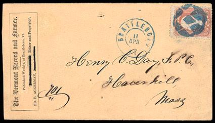 1861, 3¢ rose. Tied by complete bold blue fancy Masonic Negative Square and Compass cancel ton fresh cover to Haverhill, Mass., matching "Brattleboro, Vt. Apr 11" cds, corner card at left for the Vermont Record and Farmer, Very Fine and choice, with 2016 P.F. certificate. Scott No. 65; Estimate $300 - 400. US$300-400 (Image)