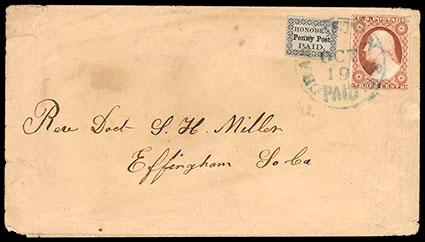 AN EXTREMELY RARE HONOUR'S "PENNY POST" AND 1851 3¢ ISSUE COMBINATION ON COVER - ONE OF ONLY TWO KNOWN COVERS THE THIS HONOUR'S ISSUE TIED SOLELY BY THE CHARLESTON CIRCULAR DATE STAMP.
