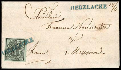Hanover, 1850, 1ggr black on gray blue. Four margin single tied on 1852 folded letter from Herzlacke to Meppen with straightline "Herzlacke" in blue, a second strike at upper right, backstamped with boxed "Meppen 14 Jun" receiving datestamp, paying the 1 Gutegrochen domestic rate, Extremely Fine and choice. Michel No. 1. Scott No. 1; Estimate $150 - 200. US$150-200 (Image)
