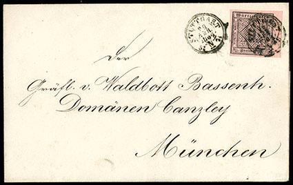 Württemberg, 1851, 9kr black on rose. Large margin single with sheet margin at right, tied on 1854 letter sheet from Stuttgart to Munich with "Stuttgart 29 Apr, 1854" double ring cds, Extremely Fine, scarce in this condition. Michel No. 4a. Scott No. 5; Estimate $150 - 200. US$150-200 (Image)