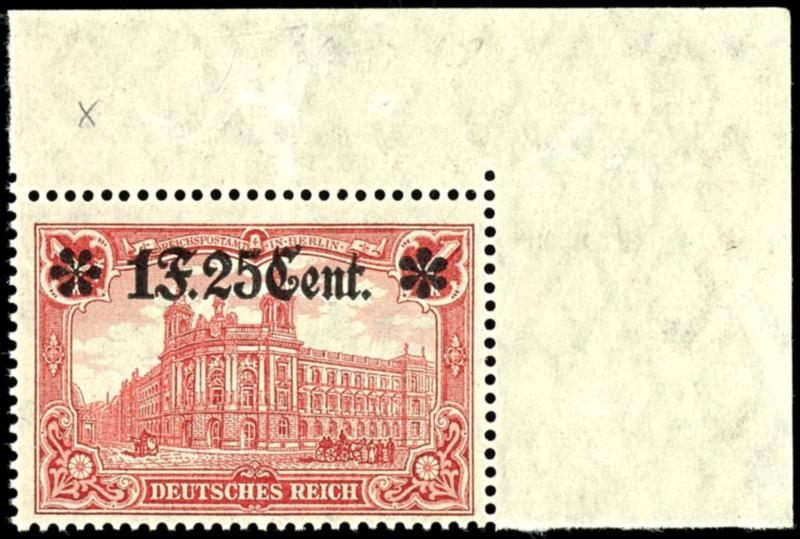 1 Fr. 25 cent on 1 Mark, right margin copy mint never hinged (affixed spot in the margin), Michel 200.- (8) (7 % import duty will be charged on the hammer price, if this lots is shipped within the EC or the UK).