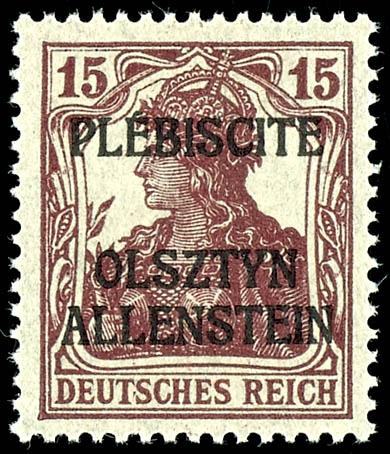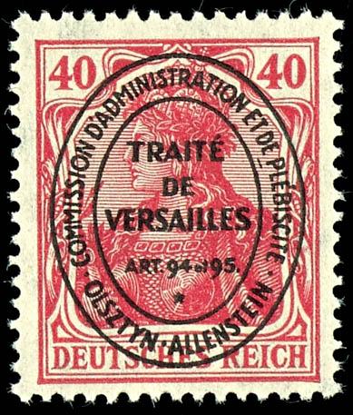 1, 25 Mark with three line typography overprint "PLEBISCITE OLSZTYN ALLENSTEIN", lower margin copy from position 48 with plate flaw of basic stamp I "E in REICH horizontal broken" - only by one part of issue occurring, mint never hinged, very fine, unsigned, Michel so far not listed (11PFI)