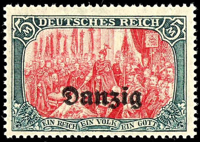 10 pfennigs to 5 Mark with overprint "Gdansk", without 3 Mark, for that 2 and 2, 50 Mark in an and b-colour, mint never hinged, perfect, Michel 120.- (1/12,14,15)