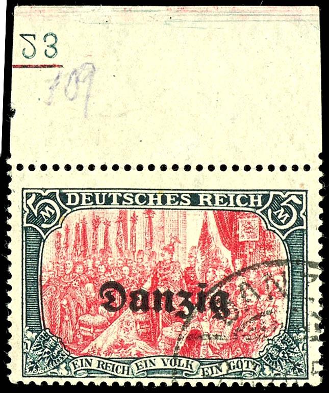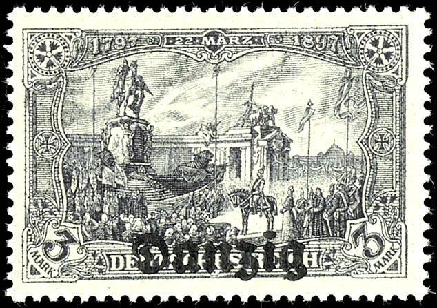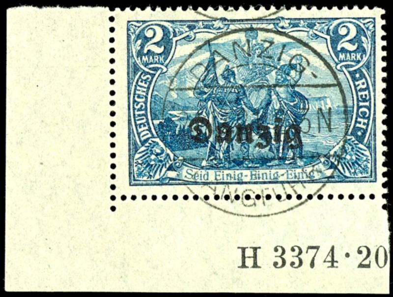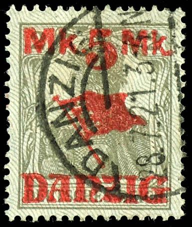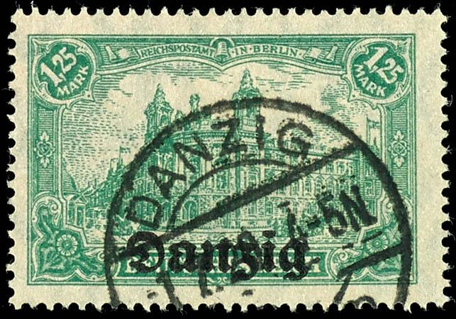 1,25 Mark Deutsches Reich mit schwarzem Bdr.-Aufdruck "Danzig, dunkelbläulichgrün, zeitgerecht entwertet "Danzig * 1n -1.7.20", tadellose Erhaltung, Fotobefund Gunnar Gruber BPP "echt und einwandfrei", Mi. 300.- (Image 1)(Image)