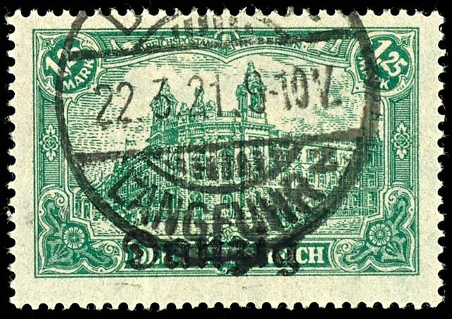 1,25 Mark Deutsches Reich mit schwarzem Bdr.-Aufdruck "Danzig, dunkelbläulichgrün, zeitgerecht entwertet "Danzig Langfuhr z 22.3.21", tadellose Erhaltung, geprüft Infla/Gruber BPP Mi. 300.- (Image 1)(Image)