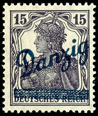 15 Pfennig Germania mit schwarzem Bdr.-Aufdruck "Danzig", schwarzbraunviolett, postfrisch, tadellose Erhaltung, geprüft Soecknick BPP, Mi. 320.- (Image 1)(Image)