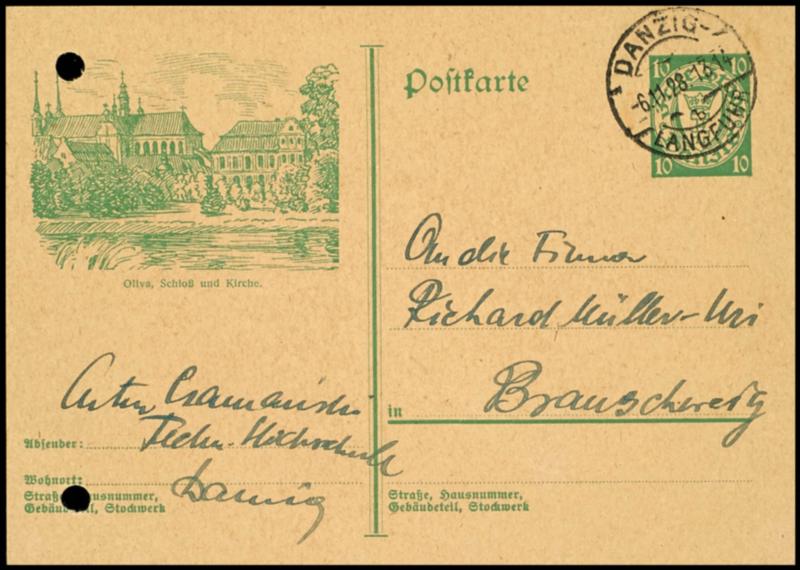 10 pfennigs national coat of arms postal stationery postcard, picture 06 "Oliva, castle and church", commercially used from "Gdansk 6.11.28" to Brunswick, file punch holes, otherwise very fine, so far are only a few examples from picture 06 are known, this was also mentioned in the newsletter of the Danzig Working Group, the collector acquired the here offered piece inside the working group for 1.000.- Euro. (P45/06)