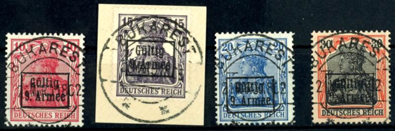 10 pfennigs to 30 pfennigs Germania with overprint \valid 9. army\, 10 pfennigs red, rose, 15 pfennigs dark violet, 30 pfennigs in the war time printing, neat cancelled \Bucharest\, photo expertize Berend Hey BPP \perfect\, Michel 389.- (illustration see online catalogue) (1/4) Certificate 10 Pfennig bis 30 Pfennig Germania mit Aufdruck \Gültig 9. Armee\, 10 Pfennig rot, rosa, 15 Pfennig dunkelviolett, 30 Pfennig im Kriegsdruck, tadellos gestempelt \BUKAREST\, Fotobefund Berend Hey BPP \einwandfrei\, Mi. 389.- (Abbildung siehe Onlinekatalog) (Image)