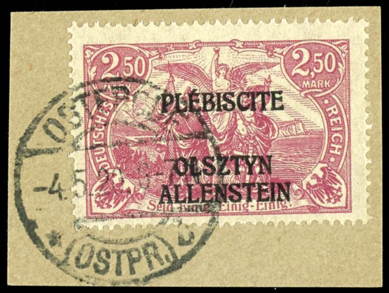 15 pfennigs Germania carmine brown with three line typography overprint, overprint higher standing - so-called victory stamp, neat cancelled \Allenstein . 7.20\, very fine, photo expertize Berend Hey BPP (4b) Certificate 15 Pfennig Germania karminbraun mit dreizeiligem Bdr.-Aufdruck, Aufdruck höher stehend - sog. Siegesmarke, tadellos gestempelt \Allenstein ...7.20\, tadellose Erhaltung, Fotoattest Berend Hey BPP (Image)