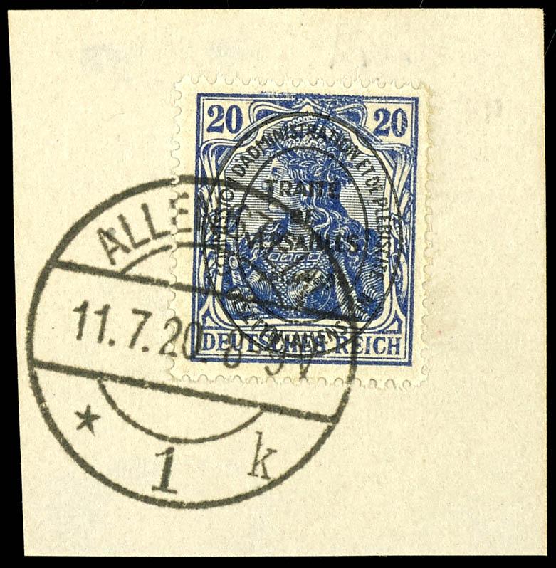 20 pfennigs Germania lilac ultramarine with oval overprint on piece, neat cancelled \ALLENSTEIN 11.7.20\, expertized Hey BPP, Michel 150.- (19a) 20 Pfennig Germania lilaultramarin mit ovalem Aufdruck auf Briefstück, tadellos gestempelt \ALLENSTEIN 11.7.20\, gepr. Hey BPP, Mi. 150.- (Image)