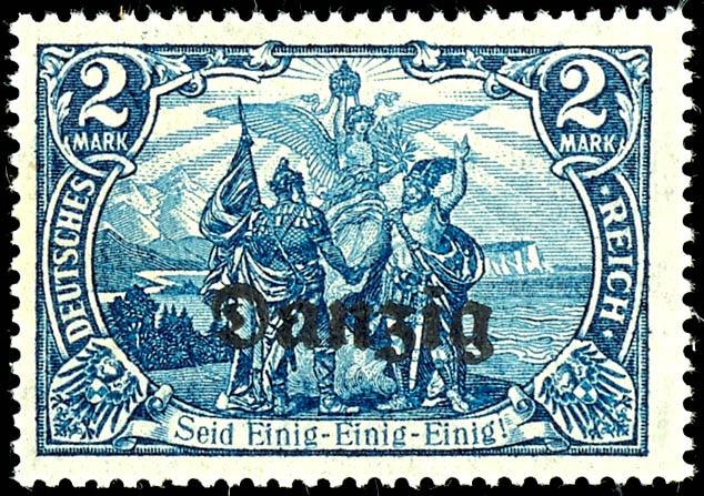 2 Mark dark blue with overprint \Gdansk\, variety \double overprint, unused with original gum, very fine, photo expertize Gunnar Gruber BPP \in perfect quality. \, Michel 450.- (11aDD) Certificate 2 Mark dunkelblau mit Aufdruck \Danzig\, Abart \doppelter Aufdruck, ungebraucht mit Originalgummierung, tadellose Erhaltung, Fotoattest Gunnar Gruber BPP \in einwandfreier Qualität.\, Mi. 450.- (Image)