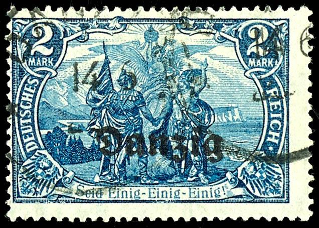 2 Mark German Reich with typography overprint \Gdansk\, blackish blue, scarce colour variety, used, date-appropriate \Gdansk 1.14 6 20\, very fine, photo expertize Gunnar Gruber BPP (2013), \genuine and immaculate\, Michel 1.800.- (11c) Certificate 2 Mark Deutsches Reich mit Buchdruck-Aufdruck \Danzig\, schwärzlichblau, seltene Farbvariante, gestempelt, zeitgerecht \DANZIG 1. 14 6 20\, tadellose Erhaltung, Fotoattest Gunnar Gruber BPP (2013), \echt und einwandfrei\, Mi. 1.800.- (Image)