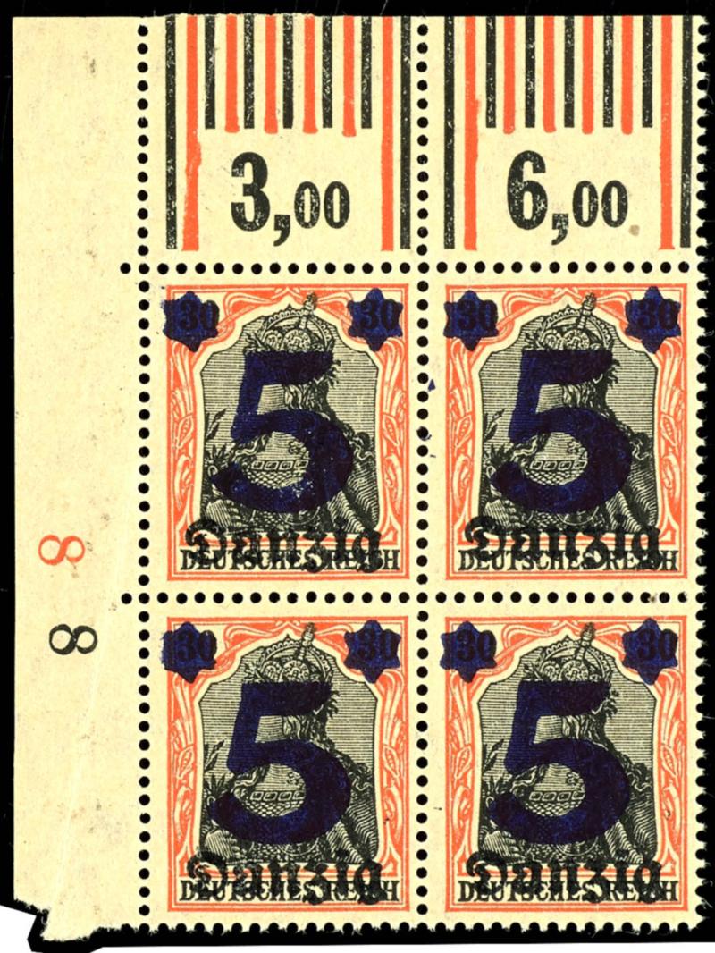 5 pfennigs on 30 pfennigs Germania, left upper corner margin block of four in the gyratory (cylinder) printing, right lower stamp with PF I \lower foot of the first e in German bent (Feld12) \, like DR 89 II PFI, mint never hinged, diagonal crease by the left margin of sheet, photo expertize Gunnar Gruber BPP, Michel 300.- (16I) Certificate 5 Pfennig auf 30 Pfennig Germania, linker oberer Eckrandviererblock im Rotations-(Walzen)druck, rechte untere Marke mit PF I \unterer Fuß des ersten e in Deutsches verbogen (Feld12)\, wie DR 89 II PFI, postfrisch, Schrägbug durch den linken Bogenrand, Fotoattest Gunnar Gruber BPP, Mi. 300.- (Image)