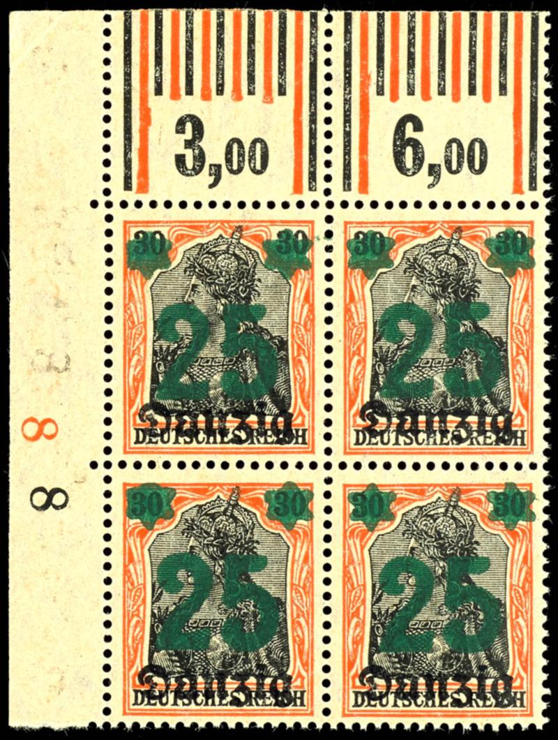 25 pfennigs on 30 pfennigs Germania, left upper corner margin block of four in the gyratory (cylinder) printing, right lower stamp with PF I \lower foot of the first e in German bent (Feld12) \, like DR 89 II PF I, mint never hinged, photo expertize Gunnar Gruber BPP (2019) \genuine and immaculate\, Michel 300.- (18I) Certificate 25 Pfennig auf 30 Pfennig Germania, linker oberer Eckrandviererblock im Rotations-(Walzen)druck, rechte untere Marke mit PF I \unterer Fuß des ersten e in Deutsches verbogen (Feld12)\, wie DR 89 II PF I, postfrisch, Fotoattest Gunnar Gruber BPP (2019) \echt und einwandfrei\, Mi. 300.- (Image)