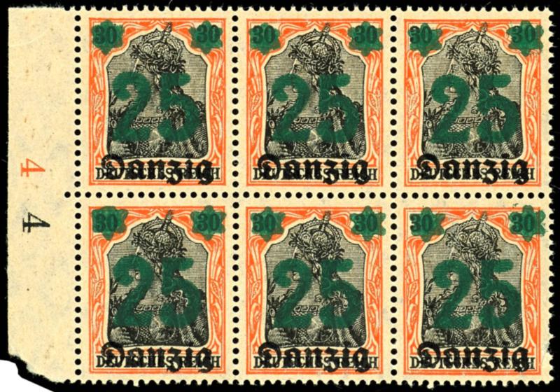 25 pfennigs on 30 pfennigs Germania, block of six in the gyratory (cylinder) printing from left margin of sheet, fields 81-83 and 91-93, with PF II \0 of the right indication of value 30 thin and higher (Feld83) \, like DR 89 II PFII, mint never hinged, small perforation fault right at the position 93, photo expertize Gunnar Gruber BPP (2019), Michel 300.- (18II) Certificate 25 Pfennig auf 30 Pfennig Germania, Sechserblock im Rotations-(Walzen)druck vom linken Bogenrand, Felder 81-83 und 91-93, mit PF II \0 der rechten Wertangabe 30 dünn und höherstehend (Feld83)\, wie DR 89 II PFII, postfrisch, kleiner Zahnfehler rechts am Bogenfeld 93, Fotoattest Gunnar Gruber BPP (2019), Mi. 300.- (Image)