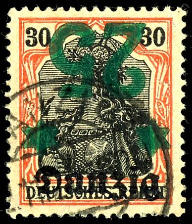 25 pfennigs on 30 Pfg Germania with inverted, emerald-green overprint, used \Gdansk. 11.20 11-12 V\, but scarcely date-appropriate cancel, very fine, Corresponding photo expertize Helmut Oechsner BPP (1994) \complete flawless\, owner sign, Michel 300.- (18K) Certificate 25 Pfennig auf 30 Pfg Germania mit kopfstehendem, smaragdgrünem Aufdruck, gestempelt \DANZIG ..11.20 11-12V\ , aber wohl nicht zeitgerechtem Stempel, tadellose Erhaltung, entsprechendes Fotoattest Helmut Oechsner BPP (1994) \vollkommen einwandfrei\, Besitzerzeichen, Mi. 300.- (Image)