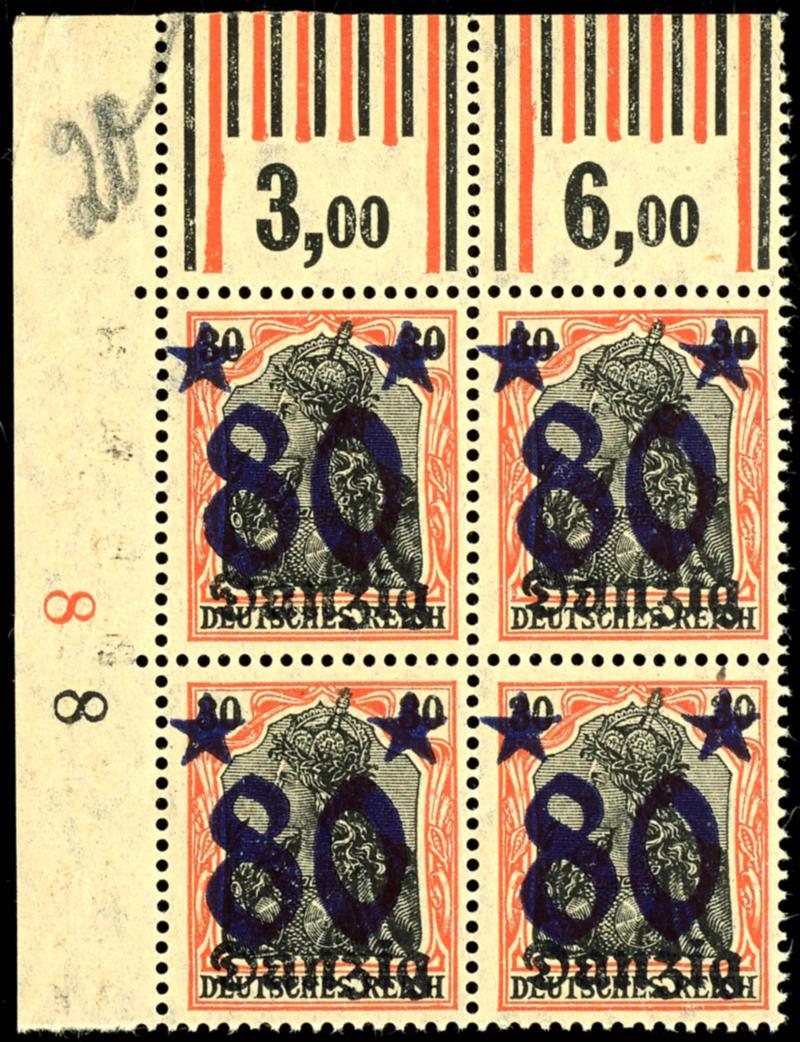 80 pfennigs on 30 pfennigs Germania, left upper corner margin block of four in the gyratory (cylinder) printing, right lower stamp with PF I: \lower foot of the first e in German bent (Feld12) \, like DR89 II PFI, mint never hinged, photo expertize Gunnar Gruber BPP \genuine and immaculate\, Michel 300.- (20I) Certificate 80 Pfennig auf 30 Pfennig Germania, linker oberer Eckrandviererblock im Rotations-(Walzen)druck, rechte untere Marke mit PF I: \unterer Fuß des ersten e in Deutsches verbogen (Feld12)\, wie DR89II PFI, postfrisch, Fotoattest Gunnar Gruber BPP \echt und einwandfrei\, Mi. 300.- (Image)