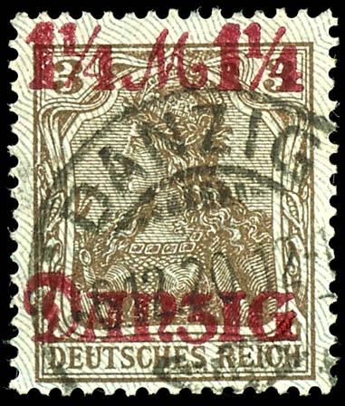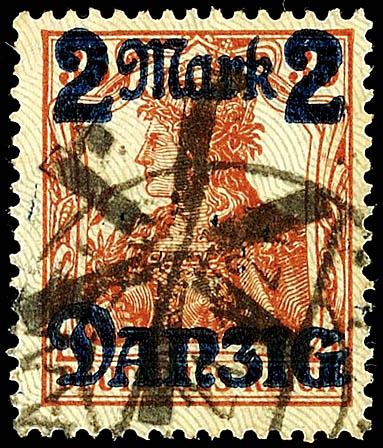 5 pfennigs Germania with blue overprint Gdansk \so-called oblique overprint\, with overprint flaw I \overprint Denzig \e\ instead of \a\, plates 1, 4, and 5, field 88) \, centric cancellation, very fine, photo expertize Gunnar Gruber BPP \postmark genuine, perfect\, Michel 200.- (21AFI) Certificate 5 Pfennig Germania mit blauem Aufdruck Danzig \sogenannter Schrägaufdruck\, mit Aufdruckfehler I \Aufdruck Denzig \e\ statt \a\,Platten 1,4, und 5, Feld 88)\, zentrisch gestempelt, tadellose Erhaltung, Fotobefund Gunnar Gruber BPP \Stempel echt, einwandfrei\, Mi. 200.- (Image)