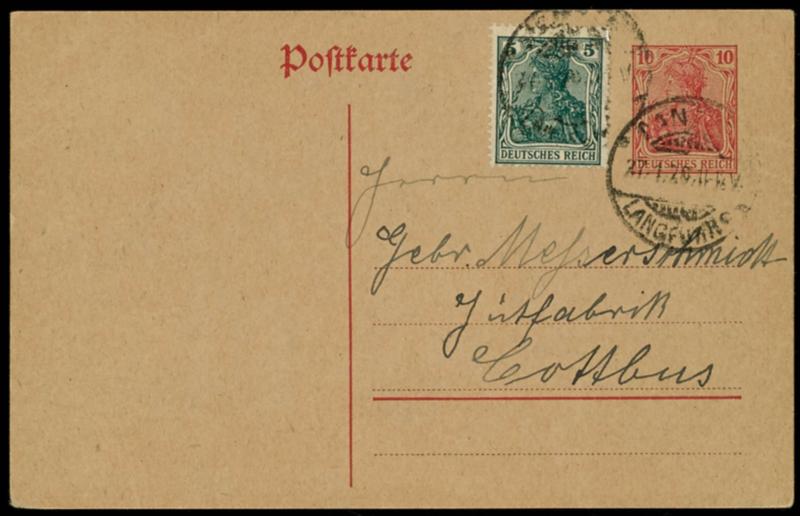 10 pfennigs postal stationery postcard with additional franking 5 pfennigs Germania as precursor card from \Gdansk Langfuhr 27.1.20\ to Cottbus, multiline text, Michel 200.- (VP107) 10 Pfennig Ganzsachenkarte mit Zufrankatur 5 Pfennig Germania als Vorläuferkarte von \Danzig Langfuhr 27.1.20\ nach Cottbus, mehrzeiliger Text, Mi. 200.- (Image)