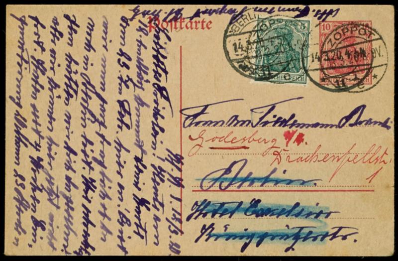 10 pfennigs Germania postal stationery postcard with additional franking 5 pfennigs Germania as precursor card from \Sopot 14.3.20\ to Berlin and then forwarded to Godesburg, Michel 200.- (VP107) 10 Pfennig Germania Ganzsachenkarte mit Zufrankatur 5 Pfennig Germania als Vorläuferkarte von \ZOPPOT 14.3.20\ nach Berlin und dann nachgesandt nach Godesburg, Mi. 200.- (Image)