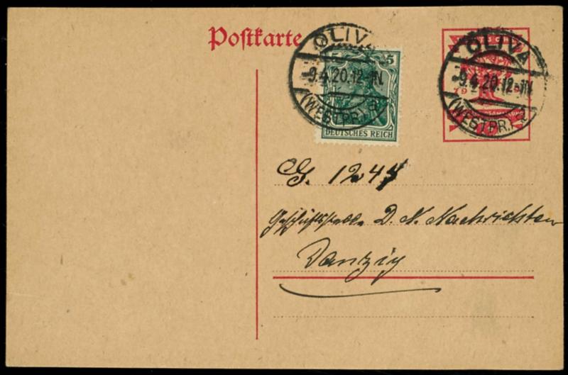 10 pfennigs National Assembly postal stationery postcard with additional franking 5 pfennigs Germania as precursor card from \OLIVA 9.4.20\ to Gdansk, Michel 175.- (VP115) 10 Pfennig Nationalversammlung Ganzsachenkarte mit Zufrankatur 5 Pfennig Germania als Vorläuferkarte von \OLIVA 9.4.20\ nach Danzig, Mi. 175.- (Image)